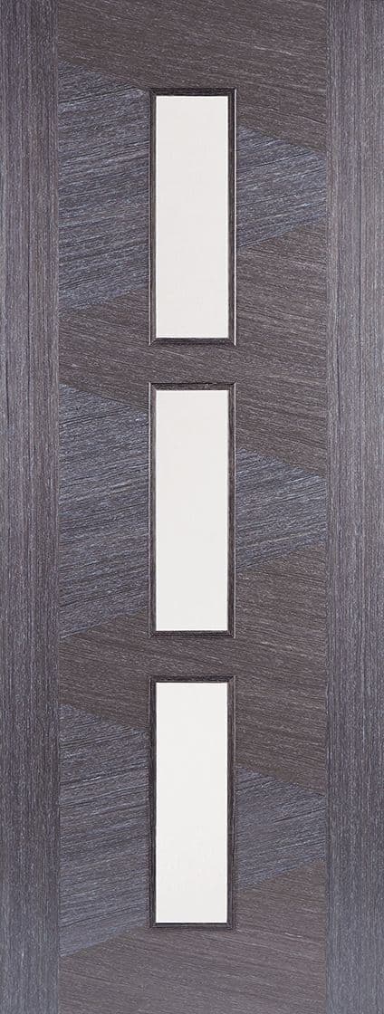 Criss-cross pre-finished Ash Grey wood grain patterns frame three clear glazed centre panels, with raised moulding on both sides.
